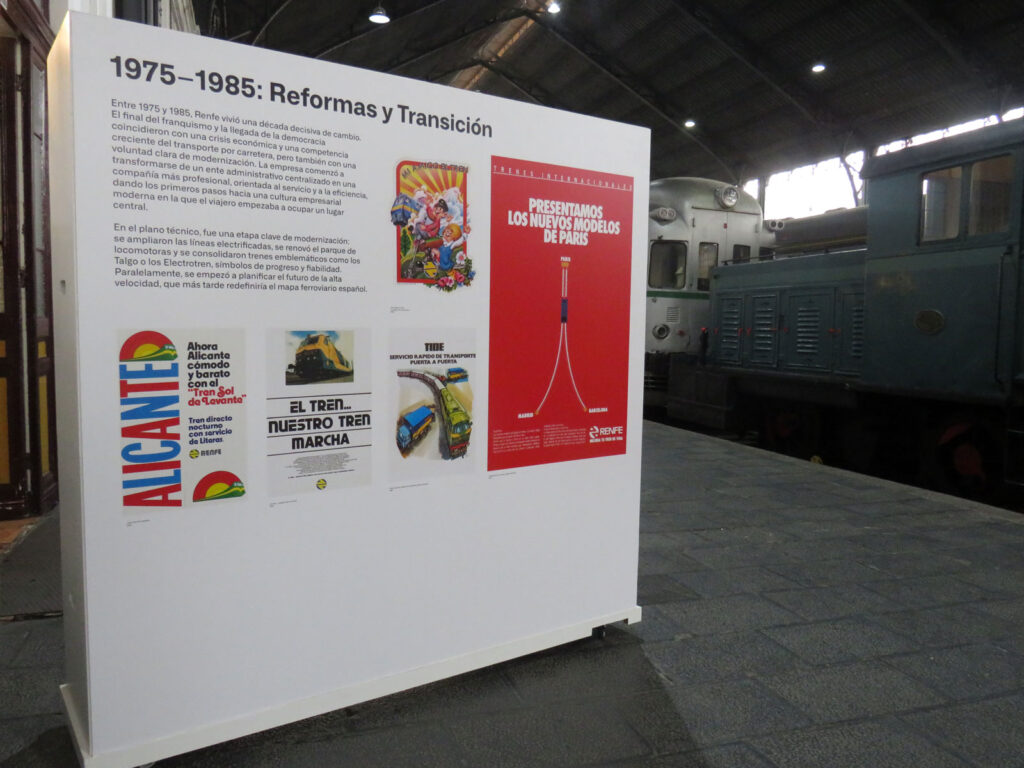 La exposición reúne piezas emblemáticas, como carteles históricos, anuncios de prensa, objetos promocionales y fragmentos audiovisuales que han acompañado las campañas más recordadas de Renfe. Cada elemento está acompañado por información contextual que ayuda a comprender no solo el “qué”, sino también el “por qué” de cada pieza: qué significaba para la sociedad de la época y qué valores transmitía.